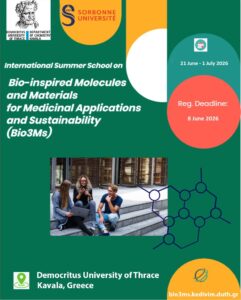 The Training and Lifelong Learning Center (TLLC) of Democritus University of Thrace organizes the Lifelong Learning Program entitled: “Bio – inspired Molecules and Materials for Medicinal Applications and Sustainability” from 22/06/2026 to 01/07/2026 The scientific coordinator is Dr. Eleni Apostolidou.