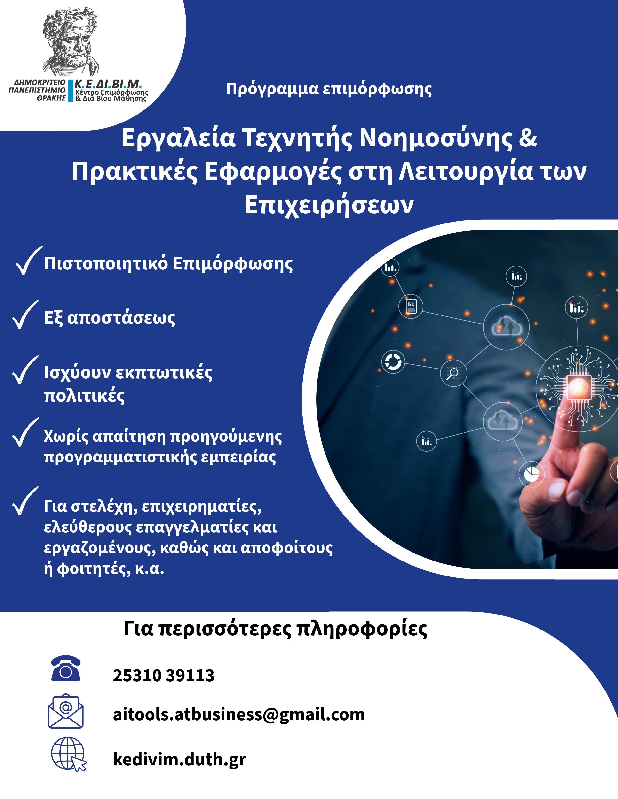 Το ΚΕΔΙΒΙΜ-ΔΠΘ διοργανώνει Εκπαιδευτικό/Επιμορφωτικό Πρόγραμμα με τίτλο: «ΕΡΓΑΛΕΙΑ ΤΕΧΝΗΤΗΣ ΝΟΗΜΟΣΥΝΗΣ & ΠΡΑΚΤΙΚΕΣ ΕΦΑΡΜΟΓΕΣ ΣΤΗ ΛΕΙΤΟΥΡΓΙΑ ΤΩΝ ΕΠΙΧΕΙΡΗΣΕΩΝ» από 23/05/2026 έως 28/05/2026 με Επιστημονικό & Ακαδημαϊκό Υπεύθυνο τον Δρ. Βενέτη Κανακάρη.